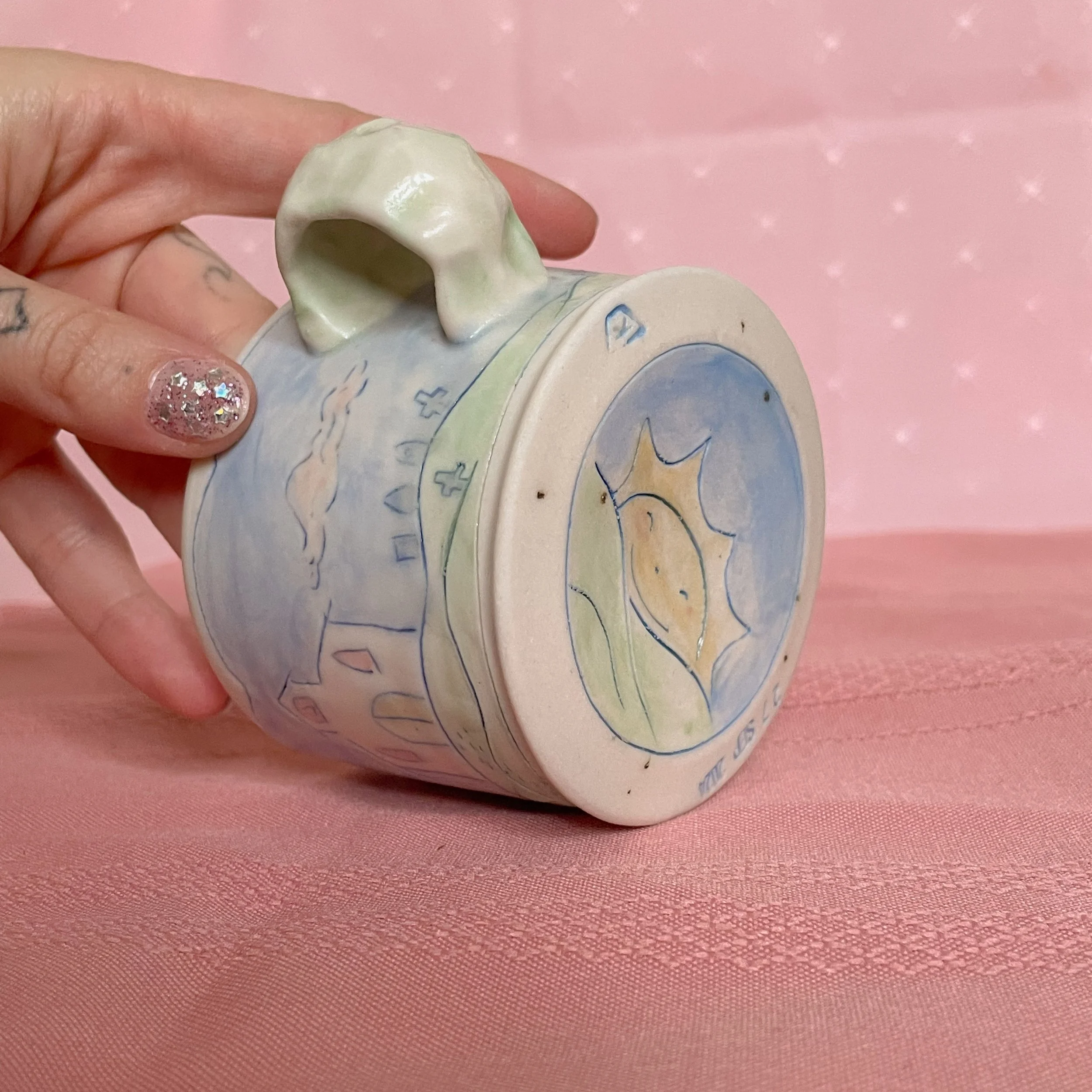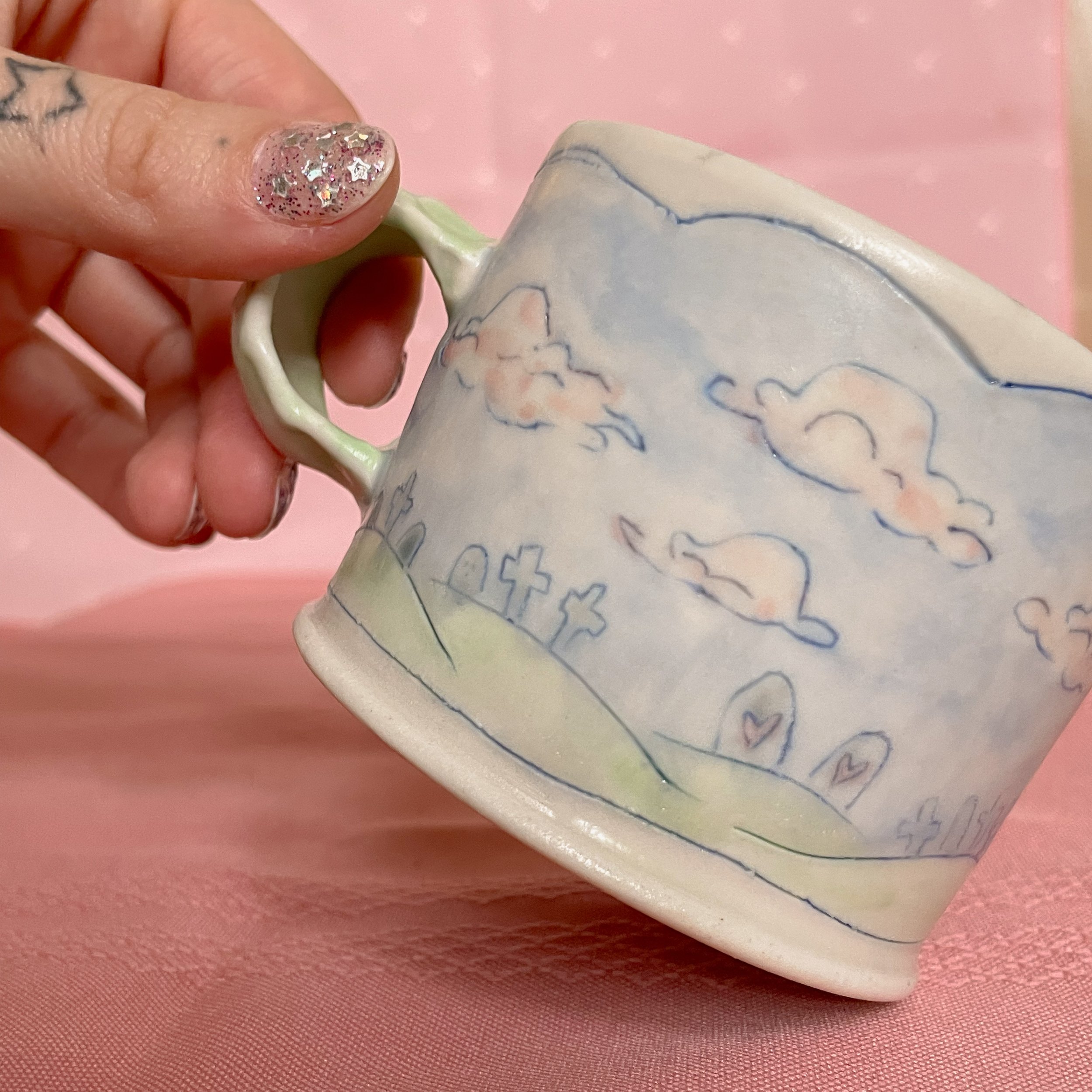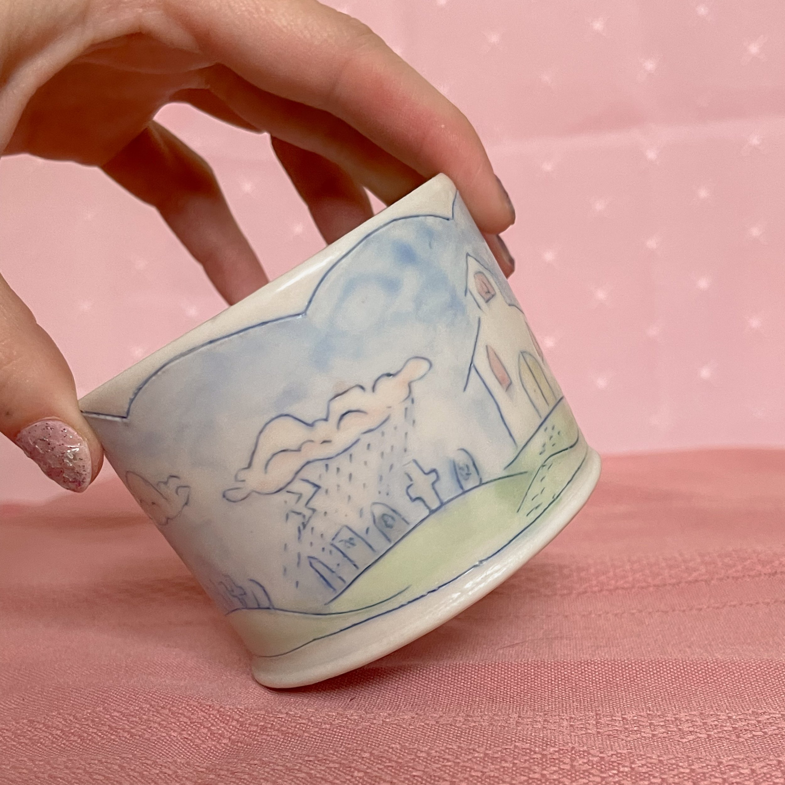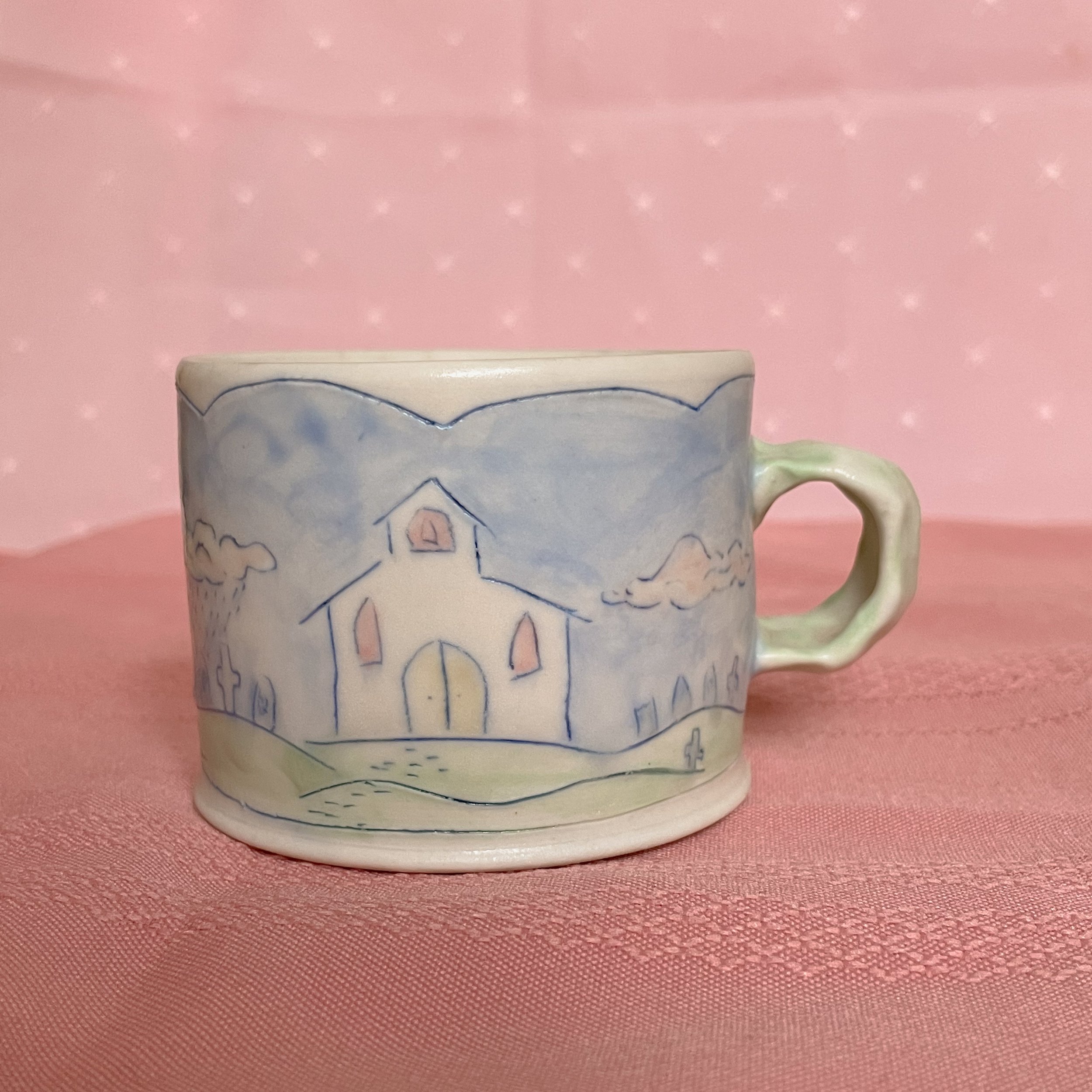 Shop <3 › Cemetery Mug Image 1 of 6 Image 2 of 6 Image 3 of 6 Image 4 of 6 Image 5 of 6 Image 6 of 6 Cemetery Mug CA$60.00 Handmade porcelain mug decorated with a cemetery and church. Perfect for a late night tea or early morning coffee. Add To Cart Added! Handmade porcelain mug decorated with a cemetery and church. Perfect for a late night tea or early morning coffee.