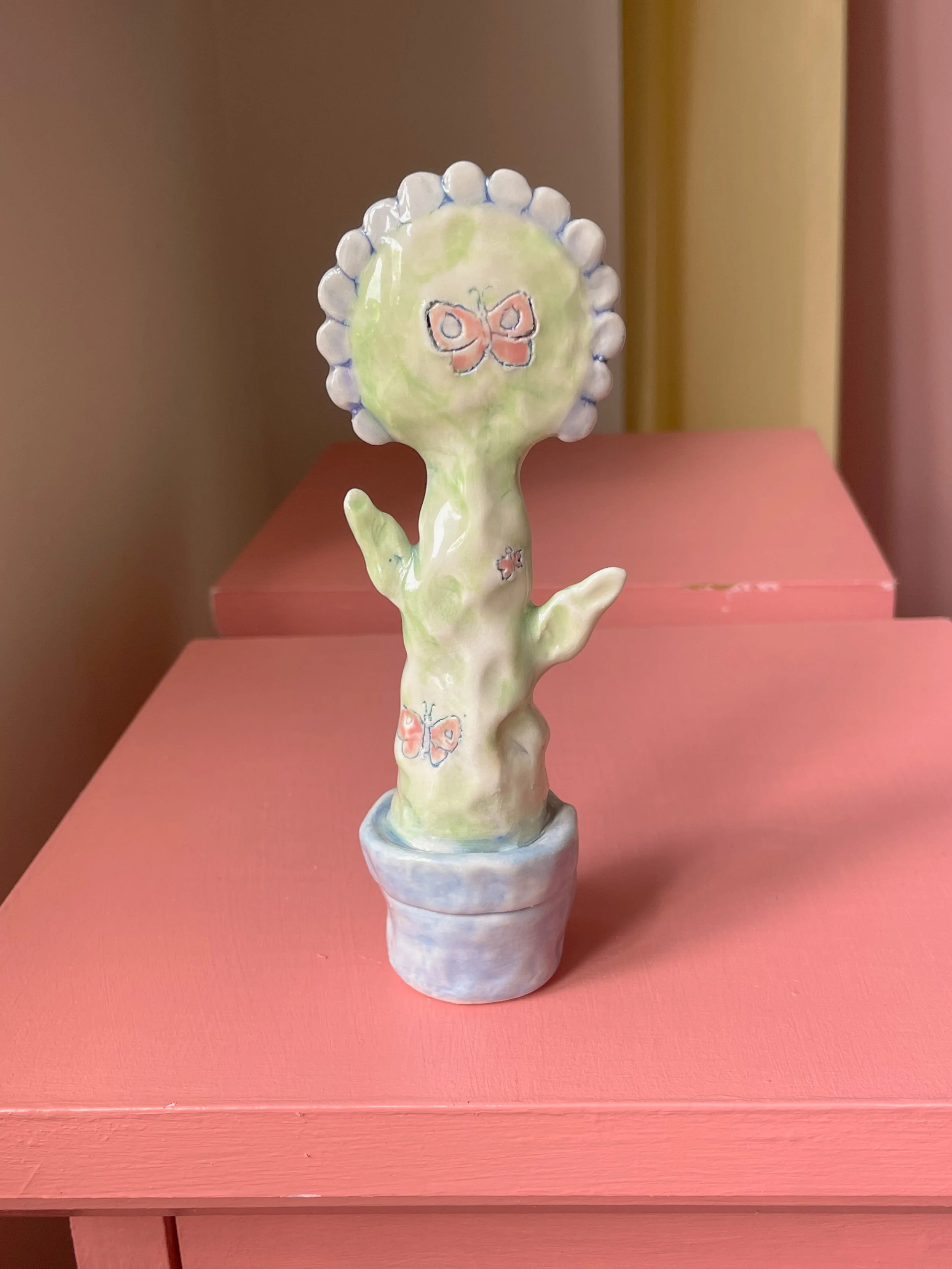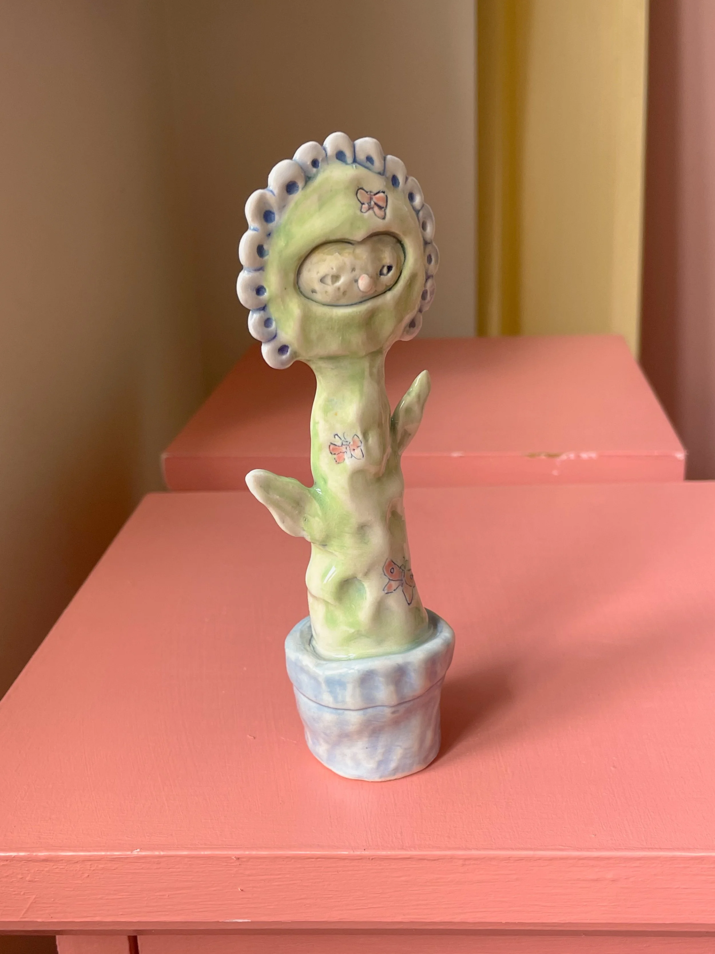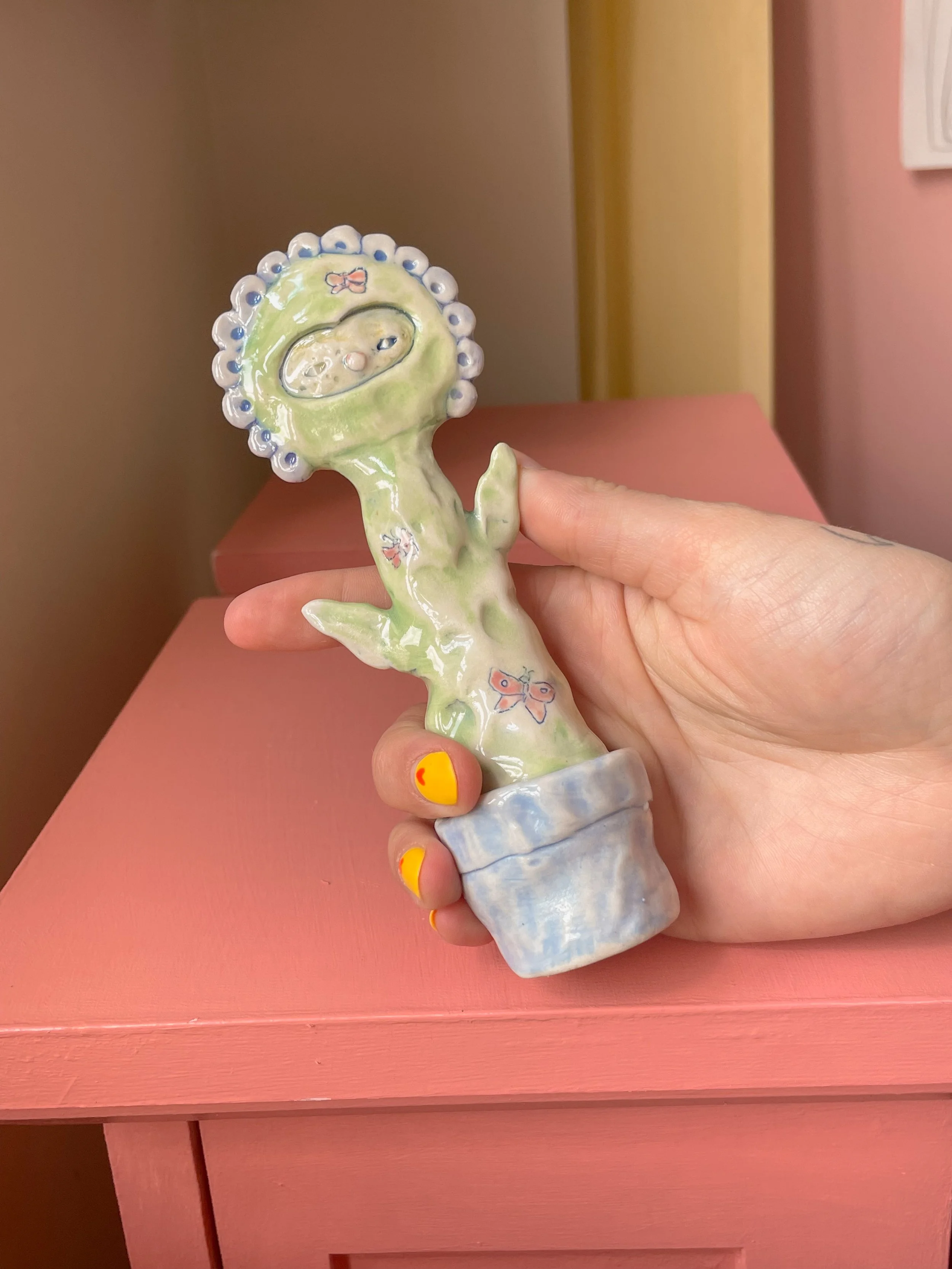 Shop <3 › Flower Friend with Butterflies <3 Image 1 of 7 Image 2 of 7 Image 3 of 7 Image 4 of 7 Image 5 of 7 Image 6 of 7 Image 7 of 7 Flower Friend with Butterflies <3 CA$140.00 sold out Handmade porcelain sculpture painted with underglaze and finished with a glossy clear glaze. <3 Sold Out Added! Handmade porcelain sculpture painted with underglaze and finished with a glossy clear glaze. <3
