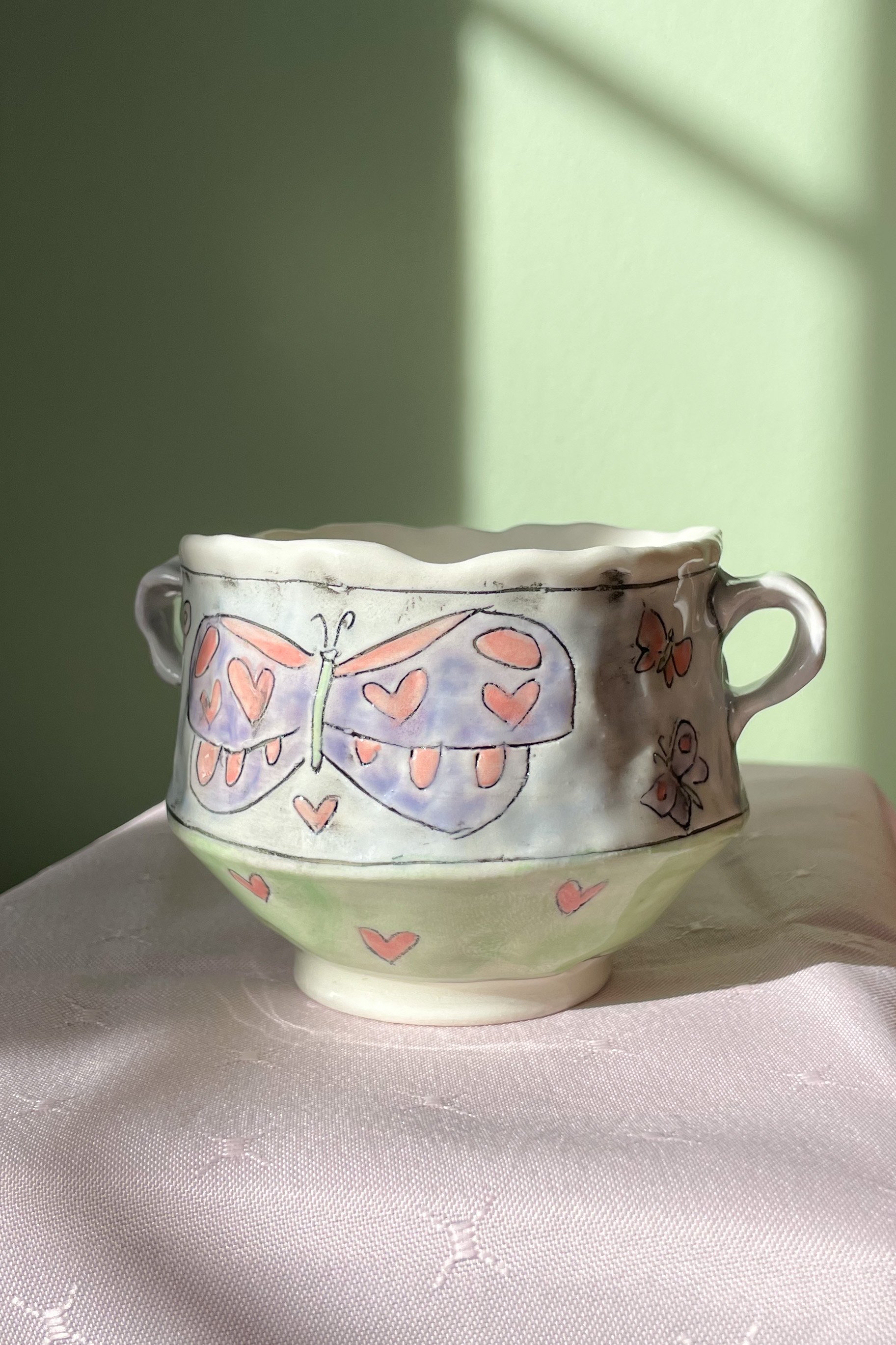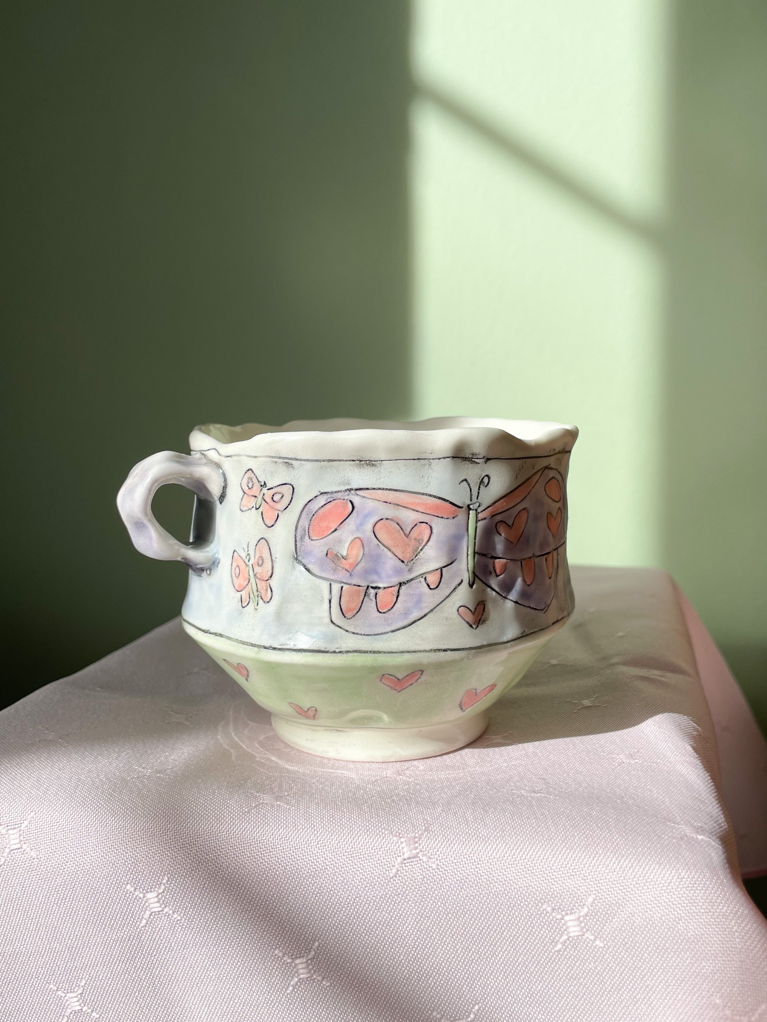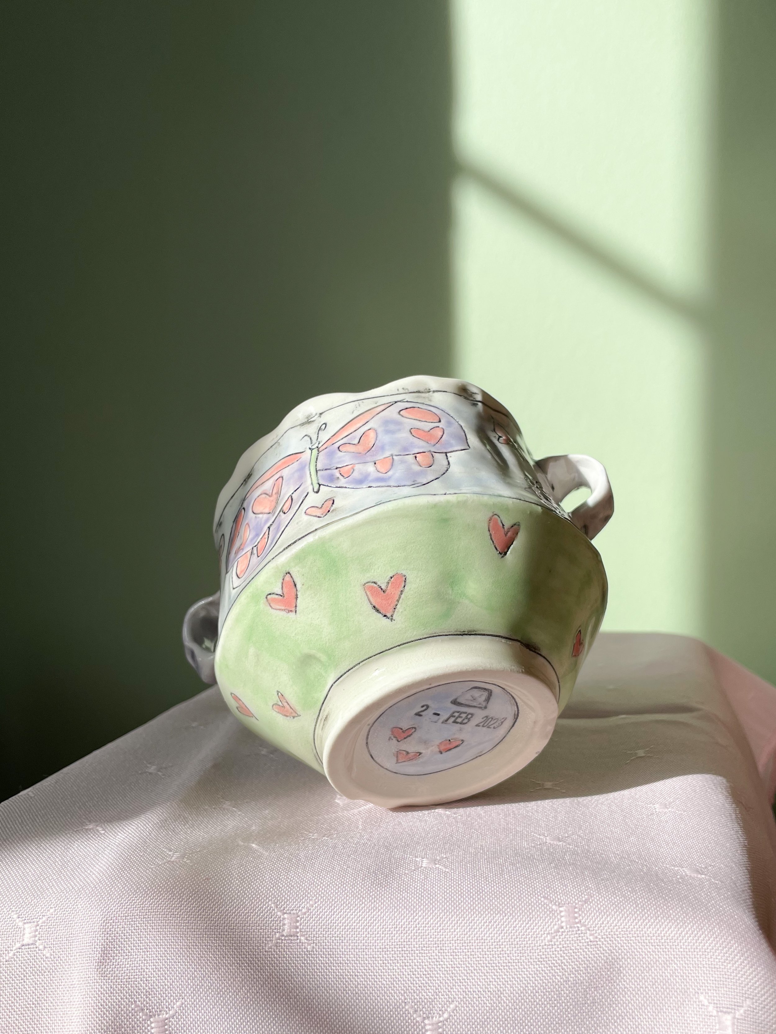 Very pretty love bug mug with some thrown parts and some hand built parts. Decorated with carved drawings, and painted with underglaze. Perfect for your favourite beverages <3