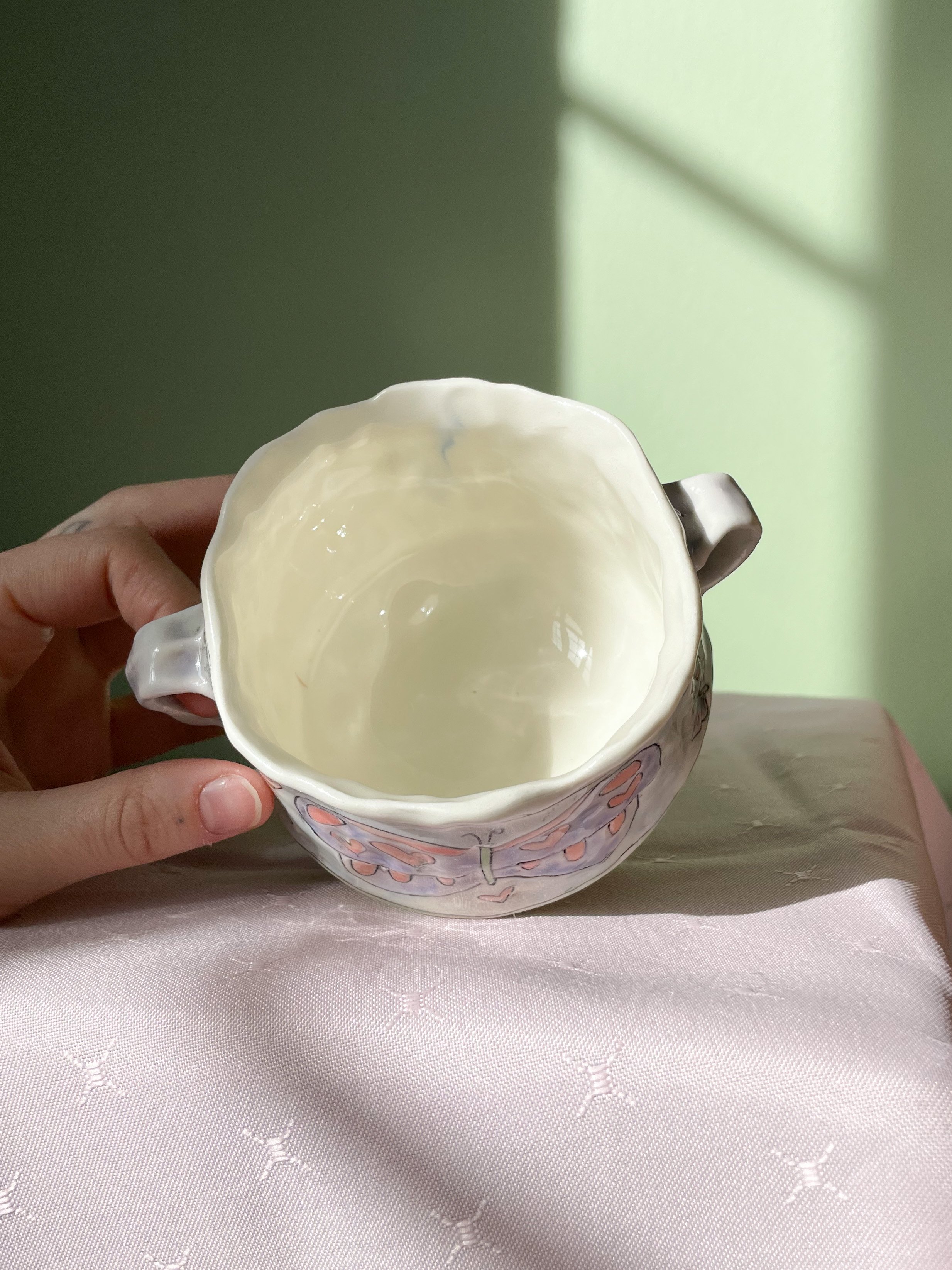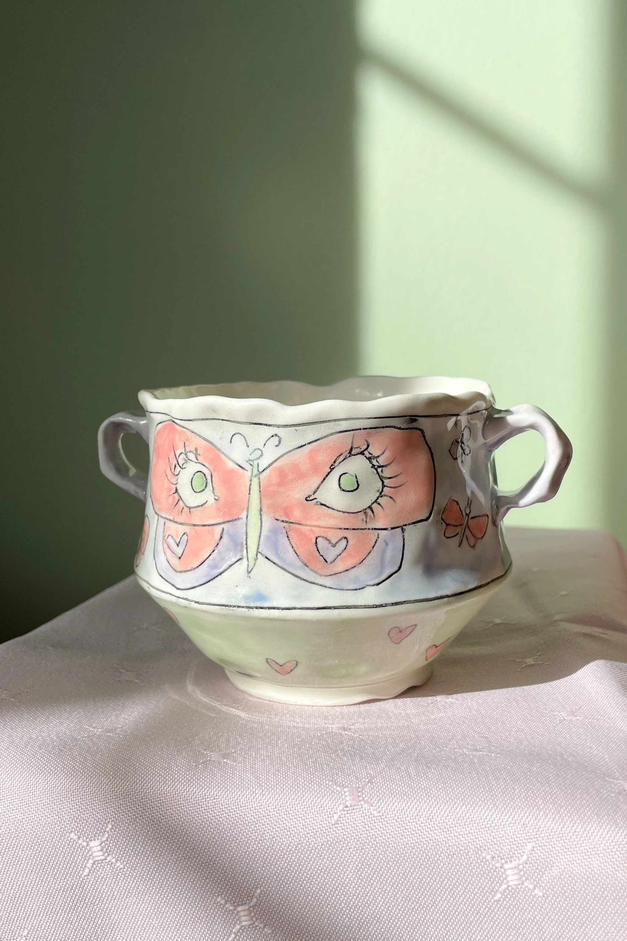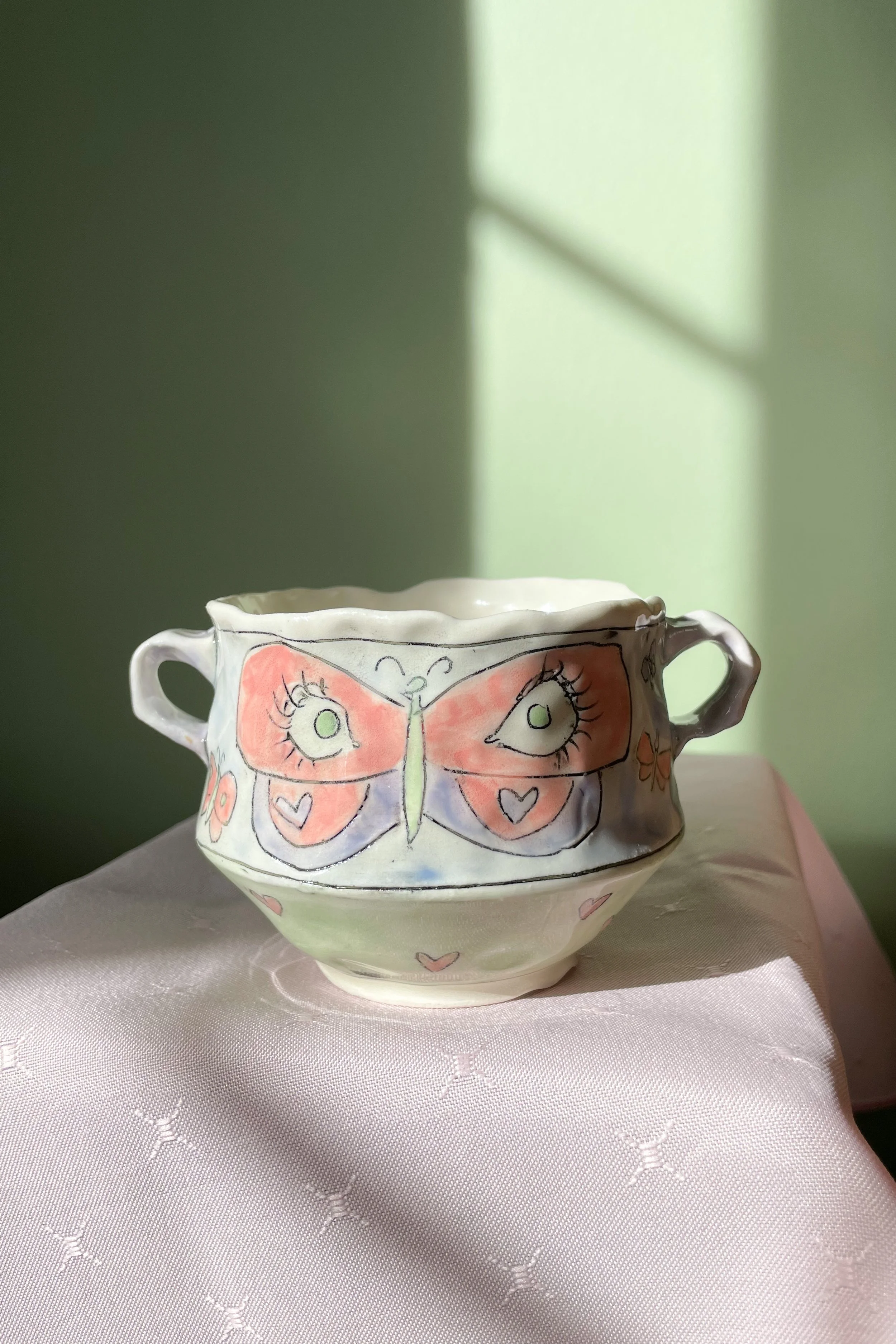 Very pretty love bug mug with some thrown parts and some hand built parts. Decorated with carved drawings, and painted with underglaze. Perfect for your favourite beverages <3